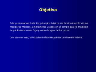 Este documento describe los principales componentes y funcionamiento de los medidores másicos. Los medidores másicos constan de tres partes principales: el sensor, el transmisor y el periférico. El sensor contiene los tubos de flujo que oscilan para medir propiedades como la masa y densidad del fluido. El transmisor procesa las señales del sensor y envía la información a los periféricos. Los periféricos muestran los datos al usuario.