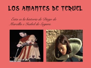 Este documento resume la historia de amor trágica entre Diego de Marcilla e Isabel de Segura en Teruel, España. Diego le pidió a Isabel cinco años para conseguir una fortuna para casarse, pero al finalizar el plazo ella se casó con otro hombre. Cuando Diego llegó a la boda para darle un último beso a Isabel, ella se lo negó y él murió de amor. Más tarde, cuando Isabel fue a darle el beso a su tumba, también murió. Desde entonces han estado enterrados juntos en un mausoleo. C