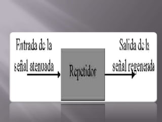Este documento describe los diferentes tipos de dispositivos de red, incluyendo hubs, repetidores, puentes, routers y gateways. Los hubs centralizan conexiones pero no tienen otras funciones. Los repetidores amplían la longitud de cable evitando atenuación de la señal. Los puentes interconectan redes que cumplen con los estándares 802, mientras que los routers trabajan a nivel de red y permiten conectar redes locales y externas usando rutas predeterminadas. Las gateways interconectan redes radicalmente diferentes trabajando a nivel de