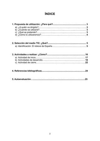 Este documento presenta una guía didáctica sobre el relieve de España dirigida a estudiantes de tercer grado de primaria. La guía consta de 27 diapositivas que abordan conceptos como paisaje, unidades de relieve en la península ibérica, y actividades interactivas. El objetivo es que los estudiantes aprendan sobre los principales sistemas montañosos, ríos, y características geográficas de España a través de definiciones, videos explicativos e interacción con mapas y ejercicios.