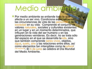 El documento resume conceptos clave sobre el medio ambiente, incluyendo su definición, orígenes del término, factores que lo componen y celebración del Día Mundial del Medio Ambiente. Explica que el medio ambiente incluye todo lo que afecta a los seres vivos y las relaciones entre ellos, y comprende factores físicos, biológicos, sociales y culturales. También describe brevemente algunos factores naturales como organismos vivos, clima y relieve geográfico que pueden beneficiar o perjudicar el med