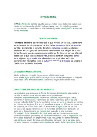 El documento proporciona información sobre el medio ambiente. Explica que el medio ambiente incluye todos los elementos bióticos y abióticos que rodean a los seres vivos. También describe algunos de los principales problemas medioambientales causados por la actividad humana como el calentamiento global debido al aumento de CO2, la lluvia ácida por emisiones industriales y el agujero de ozono causado por los CFC.