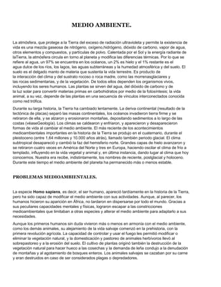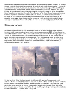 El documento describe varios problemas medioambientales causados por la actividad humana como el cambio climático debido al aumento de gases de efecto invernadero como el dióxido de carbono, la acidificación causada por la lluvia ácida, la destrucción de la capa de ozono por los clorofluorocarbonos y la contaminación por sustancias tóxicas persistentes como los pesticidas y los hidrocarburos clorados.