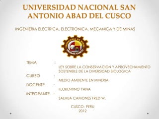 Este documento resume los principales puntos de la Ley sobre la Conservación y Aprovechamiento Sostenible de la Diversidad Biológica en Perú. La ley establece disposiciones generales, mecanismos de planificación, inventario y seguimiento, áreas protegidas, comunidades locales, investigación e innovación, y gestión de recursos genéticos. Designa a una autoridad competente para coordinar la implementación de la ley a nivel intersectorial.
