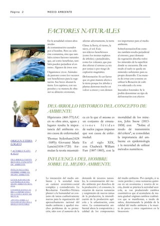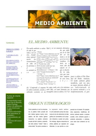 El documento habla sobre el medio ambiente. Explica el origen etimológico de los términos "medio" y "ambiente", los factores naturales que afectan el medio ambiente, el desarrollo histórico del concepto de ambiente, y la influencia del hombre sobre el medio ambiente. También describe los problemas generales del medio ambiente mundial, la importancia de la educación ambiental, y la necesidad de un desarrollo sostenible.