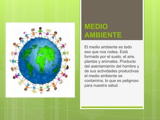 El documento habla sobre la contaminación del medio ambiente debido a la actividad humana. Explica que la contaminación ocurre en el suelo, agua y aire a través de desechos industriales y domésticos como desperdicios, químicos agrícolas, y emisiones de vehículos. También proporciona recomendaciones para prevenir la contaminación, como reutilizar el agua y reducir el uso de productos contaminantes.