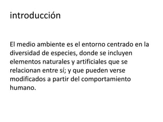 Este documento habla sobre el medio ambiente y las tres erres. Explica que el medio ambiente incluye elementos naturales y artificiales que interactúan y pueden verse afectados por el comportamiento humano. También distingue entre el medio ambiente natural y el construido. Luego describe las tres erres como las acciones más importantes que las personas pueden tomar por el medio ambiente: reducir, reutilizar y reciclar. Reduce el consumo de recursos y productos de un solo uso, reutiliza productos para darles mayor vida útil, y recicla materiales