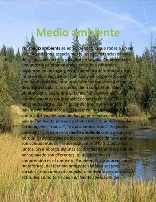 El medio ambiente incluye todo lo que rodea a los seres vivos, como plantas, animales, agua, aire y cultura. Afecta las condiciones de vida de las personas y la sociedad. Se compone de factores naturales, sociales y culturales en un lugar y tiempo determinados que influyen en los seres humanos y generaciones futuras.
