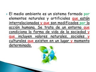 El medio ambiente es un sistema formado por elementos naturales y artificiales que están interrelacionados y modificados por la acción humana. Incluye valores naturales, sociales y culturales que existen en un lugar y momento determinado. La conservación del medio ambiente, que comprende seres vivos, suelo, aire, objetos fabricados y elementos culturales e intangibles, es imprescindible para la vida sostenible de las generaciones actuales y futuras.