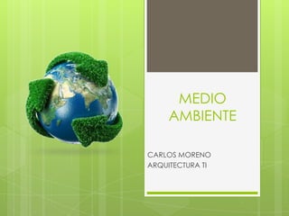 El documento define el medio ambiente como el sustento y hogar de todos los seres vivos en la biósfera, incluyendo elementos abióticos como la atmósfera y el agua, y elementos bióticos como organismos vivos. Históricamente, el fuego, la agricultura y la revolución industrial han modificado el medio ambiente natural. La contaminación ambiental se refiere a la presencia de agentes físicos, químicos o biológicos en el ambiente que pueden ser dañinos para la salud o el bienestar. La ecolog