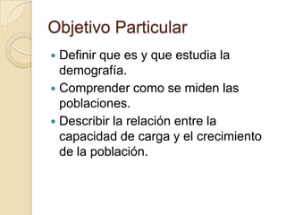 Este documento trata sobre la dinámica de las poblaciones humanas. Explica conceptos como demografía, que estudia las estadísticas de población como natalidad y mortalidad. También describe cómo se miden las poblaciones a través de tasas de crecimiento y cómo factores como fertilidad, migración y distribución por edades afectan estas tasas. Además, discute los límites biológicos y sociales de la población, incluyendo la capacidad de carga del ambiente y factores como densidad poblacional,