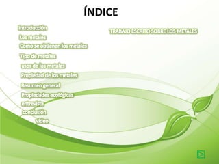 El documento proporciona información sobre los metales. Explica que los metales se obtienen de minerales extraídos de las minas y pueden reciclarse fácilmente. Luego describe algunas propiedades físicas, químicas y usos comunes de metales como el hierro, cobre, estaño, plomo, cinc y aluminio. Finalmente, enfatiza la importancia del reciclaje de metales para reducir el impacto ambiental.