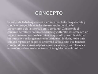 El documento define el entorno como todo lo que rodea a un ser vivo, incluyendo factores naturales, sociales y culturales que influyen en la vida de las personas y futuras generaciones. Explica que el entorno no solo incluye el espacio físico, sino también organismos vivos, objetos, agua, suelo, aire y sus interacciones, así como elementos culturales intangibles. Además, enumera algunos componentes del entorno como el clima, relieve, deforestación, sobre forestación e incendios forestales y sus efectos.