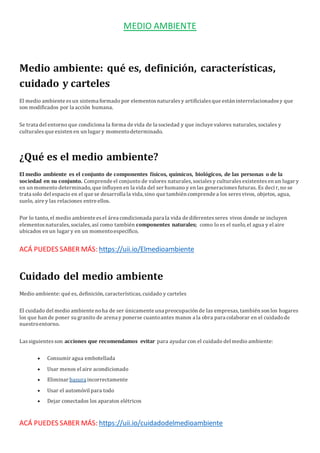 El documento define el medio ambiente como el sistema formado por elementos naturales y artificiales que están interrelacionados y son modificados por la acción humana. Incluye valores naturales, sociales y culturales en un lugar y momento determinado. El cuidado del medio ambiente no solo es responsabilidad de las empresas, sino también de los hogares. Los principales problemas del medio ambiente son la contaminación del agua y el aire, la destrucción de la capa de ozono y los bosques, los residuos urbanos y la pérdida de biodiversidad.