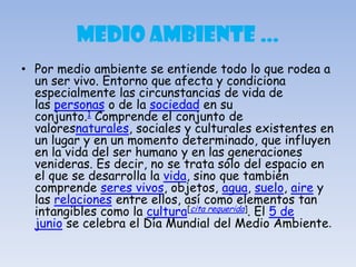 El documento habla sobre el medio ambiente y los factores que lo afectan. Define el medio ambiente como todo lo que rodea a un ser vivo, incluyendo factores naturales, sociales y culturales. Explica que el medio ambiente está compuesto por el ambiente físico, biológico y socioeconómico. También discute cómo factores como el clima, la deforestación, la sobreforestación e incendios forestales afectan negativamente el medio ambiente.