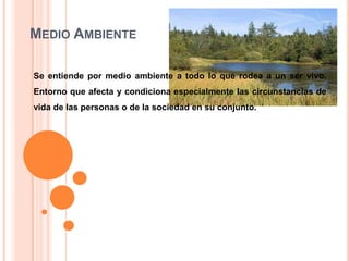 Este documento resume los principales conceptos relacionados con el medio ambiente, incluyendo factores como el ambiente físico, biológico, climático y geográfico que afectan los sistemas ambientales. También discute cómo ciertos organismos vivos como ganado y cómo factores como la deforestación, la sobreforestación e incendios forestales impactan negativamente el medio ambiente. Además, menciona que el 5 de junio se celebra anualmente el Día Mundial del Medio Ambiente establecido por la ONU en 1972.