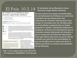 Este documento contiene varias noticias relacionadas con el medio ambiente en España. Algunas hablan de problemas como un vertedero ilegal, un dique minero que se rompió o la sequía en California. Otras informan sobre el descubrimiento de una especie de escarabajo o parques naturales que han mejorado. En general, plantea que aunque surgen amenazas, también hay esperanza si cuidamos más el medio ambiente y no solo pensamos en beneficios económicos.