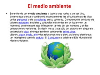 Este documento trata sobre el medio ambiente. Define el medio ambiente como todo lo que rodea a un ser vivo, incluyendo seres vivos, objetos, agua, suelo, aire y las relaciones entre ellos. Explica que existen factores naturales como organismos vivos, clima y relieve que pueden beneficiar o perjudicar el medio ambiente. También habla sobre tipos de contaminación ambiental como la contaminación del agua, suelo y aire.