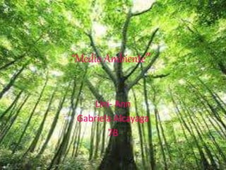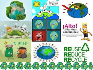 El documento habla sobre el medio ambiente y cómo podemos cuidarlo. Define el medio ambiente como todo lo que nos rodea, incluyendo elementos naturales y artificiales. Ofrece consejos para cuidar el medio ambiente como apagar la luz, reciclar, reusar y reutilizar recursos. Finalmente, enfatiza la importancia de cuidar nuestro mundo para que sea mejor.