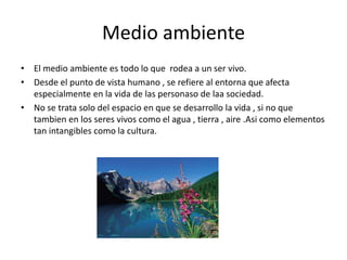 El documento habla sobre el cuidado del medio ambiente. Define el medio ambiente como todo lo que rodea a los seres vivos, incluyendo el agua, la tierra, el aire y elementos culturales. Explica que el reciclaje convierte los desechos en nuevos productos para prevenir el uso de recursos y reducir la contaminación. También describe la contaminación como la introducción de sustancias que hacen el medio ambiente inseguro, y provee ejemplos de cómo cuidar el medio ambiente, ahorrar agua y energía.