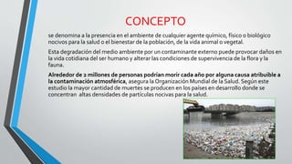 Este documento habla sobre la contaminación mundial y sus consecuencias. Define la contaminación como la presencia de agentes químicos, físicos o biológicos nocivos en el ambiente. Luego enumera los 10 países más contaminantes, los diferentes tipos de contaminación, y las consecuencias como la exterminación animal, problemas en los polos, daños marítimos, escasez de agua y hambruna. Finalmente, propone algunas soluciones como el uso de energías renovables, reducir los desechos y reciclar más.