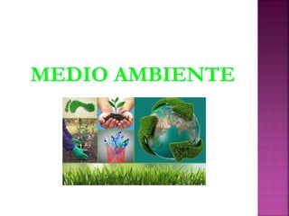 El documento describe cómo el medio ambiente está formado por elementos naturales y artificiales que están interrelacionados y modificados por la acción humana. Explica que lo mejor para cuidar el medio ambiente es ahorrar energía eléctrica, agua y recursos, y reutilizar y reciclar objetos en lugar de tirarlos. También identifica varias amenazas ambientales como la destrucción de la capa de ozono, la contaminación, el dióxido de carbono y más. Ofrece consejos prácticos para cuidar el medio ambiente como lavar ro