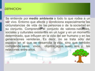 El documento define el medio ambiente como todo lo que rodea a un ser vivo, incluyendo seres vivos, objetos, agua, suelo y aire, y las relaciones entre ellos. Luego describe factores externos como el ambiente físico, biológico y la población humana. Finalmente, explica cómo factores naturales como organismos vivos, el clima, el relieve, la deforestación, la sobreforestación e incendios forestales pueden afectar positiva o negativamente el medio ambiente.