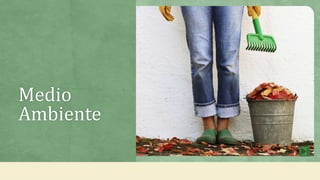 El documento resume los conceptos clave del medio ambiente, incluyendo sus constituyentes principales como la atmósfera, agua y suelo. También describe los principales problemas medioambientales causados por los seres humanos como el aumento de dióxido de carbono, la acidificación y la destrucción de la capa de ozono. La Cumbre de la Tierra de 1992 buscó abordar estos problemas a través de convenciones internacionales sobre cambio climático y biodiversidad.