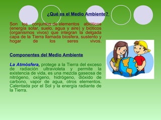 El documento define el medio ambiente como los elementos abióticos y bióticos que componen la biosfera terrestre y sustentan la vida. Explica que la atmósfera, el agua y el suelo son los principales componentes del medio ambiente y que la contaminación es la impregnación de estos con productos dañinos. También describe el calentamiento global como el aumento de las temperaturas a nivel mundial debido a los gases de efecto invernadero y sus graves consecuencias como el derretimiento de los casquetes polares y el aumento del n