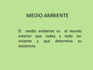 El documento trata sobre educación ambiental y la contaminación ambiental. Explica que el medio ambiente rodea a todos los seres vivos y que la contaminación es causada por actividades humanas como la deforestación. Describe los tipos de contaminantes y cómo contaminan el aire, agua y suelo, causando enfermedades. Finalmente, da recomendaciones para preservar el medio ambiente como segregar y reciclar la basura.