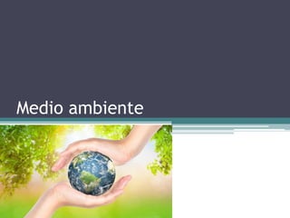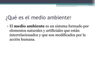 El medio ambiente es un sistema formado por elementos naturales y artificiales que están interrelacionados y que son modificados por la acción humana. El medio ambiente lo componen los seres vivos, el suelo, el agua, el aire, los objetos físicos fabricados por el hombre y los elementos simbólicos. Los factores que influyen en el medio ambiente incluyen factores físicos, biológicos y socioeconómicos. Un ecosistema es un conjunto formado por todos los factores bióticos de un área y los factores