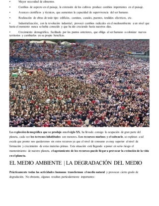 El documento describe el medio ambiente, incluyendo sus componentes físicos, biológicos y sociales, y cómo la actividad humana ha producido grandes cambios a través de la agricultura, la industrialización y el crecimiento de la población. También discute los principales problemas ambientales como la contaminación del agua y el aire, la destrucción de los bosques y la pérdida de biodiversidad. Finalmente, identifica factores naturales como el clima, la vegetación y los incendios forestales que también pueden degradar el medio ambiente