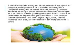 El documento habla sobre el medio ambiente y el relieve terrestre. Define el medio ambiente como el conjunto de componentes físicos, biológicos, sociales y culturales que influyen en la vida humana y futuras generaciones. Explica que el relieve terrestre se forma por irregularidades en la superficie de la Tierra y puede dar lugar a elevaciones o hundimientos, siendo el resultado de procesos tectónicos de placas que cambian continuamente la superficie.