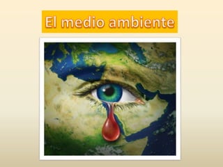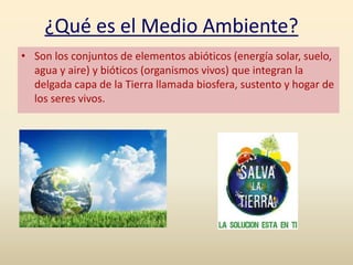 El documento define el medio ambiente como el conjunto de elementos abióticos y bióticos que integran la biosfera terrestre. Describe los principales componentes del medio ambiente como la atmósfera, el agua y el suelo. También identifica varios problemas ambientales globales como el calentamiento global, la deforestación, la contaminación y la extinción de especies.