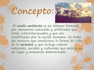El documento define el medio ambiente como el sistema formado por elementos naturales y artificiales que están interrelacionados y son modificados por la acción humana. Explica que el medio ambiente incluye factores físicos, biológicos y socioeconómicos que condicionan la vida humana. Además, destaca la importancia de preservar el medio ambiente ya que todas las formas de vida dependen de él, y la necesidad de desarrollar la educación ambiental y lograr un desarrollo sostenible.