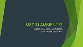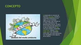 El documento habla sobre el concepto de medio ambiente y algunos factores que afectan negativamente al medio ambiente. Define el medio ambiente como el conjunto de factores naturales, sociales y culturales que influyen en la vida en un lugar. Luego menciona factores como la sobreforestación, los incendios forestales y la contaminación como amenazas al medio ambiente, explicando brevemente cómo cada uno puede perjudicar el entorno.