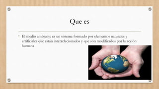 El documento define el medio ambiente como un sistema formado por elementos naturales y artificiales que están interrelacionados y modificados por la acción humana. Explica que la conservación del medio ambiente, que incluye seres vivos, suelo, agua, aire y objetos físicos, es esencial para la vida sostenible actual y futura. Además, describe cómo la ecología estudia la relación entre los seres vivos y su entorno, cuya protección garantiza la subsistencia a través de un comportamiento ecológico.