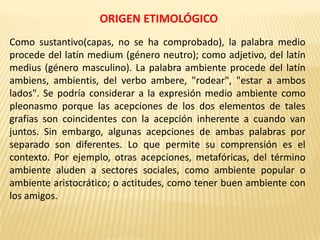 El documento trata sobre el concepto de medio ambiente. Define el medio ambiente como todo lo que rodea a un ser vivo, incluyendo factores naturales, sociales y culturales. Explica que el medio ambiente no solo incluye el espacio donde se desarrolla la vida, sino también seres vivos, objetos, agua, suelo, aire y las relaciones entre ellos. Además, menciona que el origen etimológico de las palabras "medio" y "ambiente" provienen del latín y que su uso junto refiere al conjunto de fact
