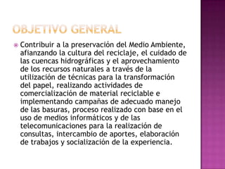 El documento resume las actividades de un proyecto universitario sobre preservación ambiental. El proyecto busca promover el reciclaje, cuidado de cuencas hidrográficas y uso sustentable de recursos naturales a través de técnicas de transformación de papel, campañas de manejo de basura y uso de medios digitales. También incluye indagar sobre fuentes de contaminación local e investigar conceptos de contaminación y protección ambiental.