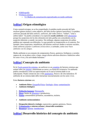 Este documento define el medio ambiente y describe los factores naturales y humanos que lo afectan. El medio ambiente incluye todo lo que rodea a los seres vivos, como el clima, la vegetación, la fauna y los seres humanos. Entre los factores naturales se encuentran los organismos vivos, el clima, el relieve geográfico y los desastres naturales. Los seres humanos también afectan el medio ambiente a través de la deforestación, la sobrepoblación y la contaminación. El 5 de junio se celebra el Día M