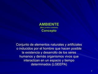 El documento analiza el marco legal y normativo del derecho ambiental en México, definiendo el medio ambiente como un bien jurídico tutelado y el derecho ambiental como un conjunto de normas que regulan las interacciones entre los seres humanos y su entorno. Se destacan atributos y principios rectores del derecho ambiental, como la prevención y la responsabilidad del contaminador, así como diversas leyes y convenios internacionales que forman parte de este marco. Además, se menciona la evolución del derecho ambiental en diferentes etapas y la legislación vigente que regula la conservación y uso sostenible de los recursos naturales.