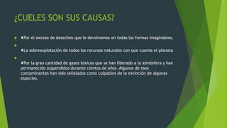 El documento trata sobre las causas y consecuencias de la contaminación ambiental. Las principales causas son el exceso de desechos, la sobreexplotación de recursos naturales y la liberación de gases tóxicos a la atmósfera. Algunas consecuencias son la deforestación, el calentamiento global causado por gases como el CO2, y el derretimiento de glaciares.