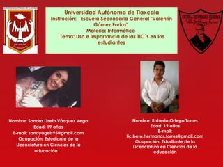 Este documento describe el uso e importancia de las tecnologías de la información y comunicación (TIC) para los estudiantes. Explica que las TIC han transformado los estilos de vida y son una herramienta útil en el aula que motiva a los estudiantes y les permite desarrollar nuevas habilidades. También detalla algunas ventajas de las TIC como la motivación, interactividad y autonomía, pero también reconoce posibles inconvenientes como la distracción y adicción.
