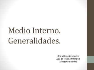 Este documento trata sobre el medio interno y la homeostasis del agua, sodio, potasio y estado ácido-base. Explica la distribución del agua en el cuerpo, las disnatremias, la fisiopatología y tratamiento de la hiponatremia y hipernatremia. También aborda la regulación del sodio y la osmolalidad, así como las hipo y hiperkalemias, sus causas y manejo. Por último, define conceptos básicos de ácido-base, las diferentes acidosis y alcalosis metabólicas y su trat