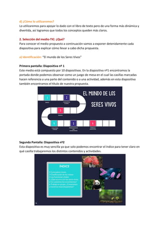 Este documento presenta una guía didáctica para utilizar un medio de imagen fija con contenido audiovisual sobre el tema de "El mundo de los Seres Vivos" dirigido a alumnos de 5o primaria. La guía incluye 10 diapositivas con actividades antes, durante y después para conocer conceptos como seres vivos, reinos biológicos, funciones vitales, ecosistemas y problemas ambientales a través de preguntas, videos e interacción grupal, con el objetivo de que los alumnos aprendan de forma dinámica y