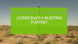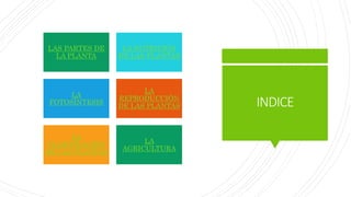 El documento proporciona información sobre las partes y funciones de las plantas, incluida la nutrición, fotosíntesis, reproducción y clasificación. Explica que las plantas necesitan agua, sales minerales, dióxido de carbono y luz solar para nutrirse, y que realizan la fotosíntesis en las hojas usando la clorofila. También cubre los tipos de reproducción de las plantas y cómo se clasifican según su tallo.