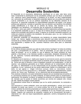 El documento trata sobre el desarrollo sostenible. Explica que el desarrollo sostenible busca satisfacer las necesidades del presente sin comprometer la capacidad de las futuras generaciones para satisfacer las suyas. También describe los orígenes del concepto en el informe de la Comisión Brundtland de 1987 y la Cumbre de la Tierra de 1992. Define el desarrollo sostenible como un proceso que garantiza los recursos para el futuro manteniendo la base de recursos naturales.