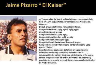 Los cuatro documentos presentan las estadísticas y logros de cuatro jugadores de fútbol de Colo Colo. Todos fueron campeones nacionales con el club y algunos también ganaron la Copa Chile y torneos internacionales como la Copa Libertadores y la Copa América. Se destacan por su talento, liderazgo y aportes técnicos al equipo como volantes, mediocampistas o delanteros con buena pegada y visión de juego.