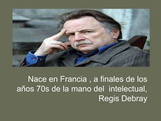 Este documento introduce el concepto de mediosferas propuesto por Regis Debray, el cual analiza cómo las tecnologías de transmisión de información a través de la historia han moldeado la cultura y el sentido de la humanidad. Las mediosferas se refieren a períodos determinados por una tecnología dominante de transmisión como el arte, la política y la religión. La transmisión asegura que las ideas perduren a lo largo del tiempo a través de los procesos de formación que experimentan.