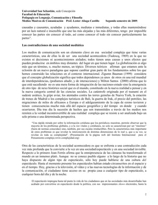 Este documento discute el rol de los medios de comunicación en la sociedad compleja del siglo 21 y el desafío que esto representa para la educación. Argumenta que vivimos en una cultura mediática donde los medios nos proveen información y modelos de comportamiento. También crean opinión pública mundial y educan junto a la escuela y familia. Por lo tanto, el sistema educativo debe estudiar los medios de comunicación. Además, señala que vivimos en una sociedad globalizada e interconectada donde los eventos tienen consecuencias a nivel mundial, lo